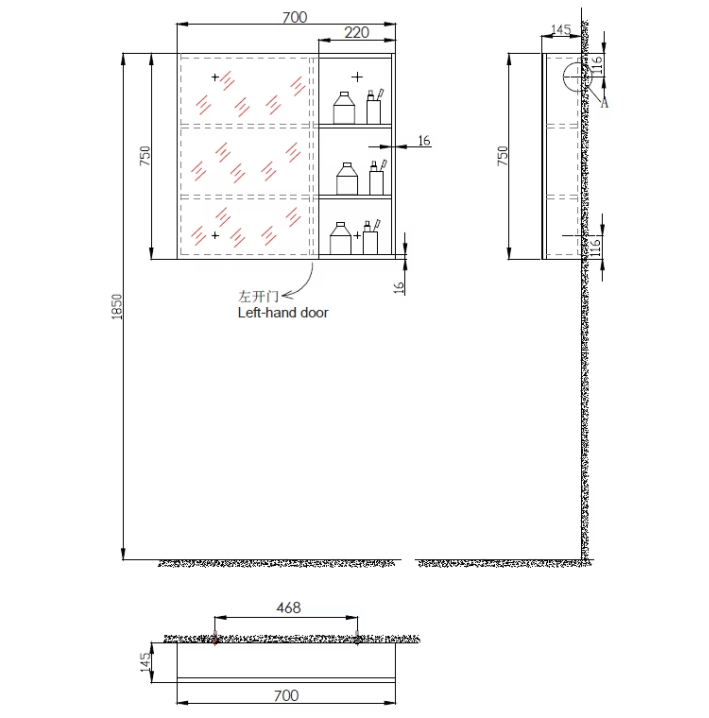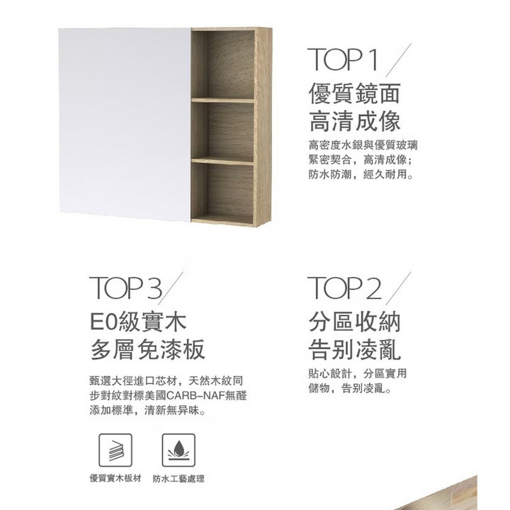 70cm 左開門鏡櫃(淺木紋)-左鏡右層板