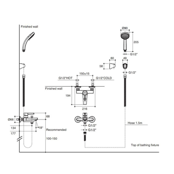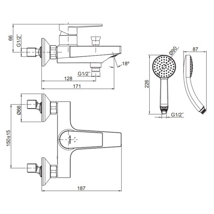 Taut 二路附牆浴缸花灑龍頭(鉻)